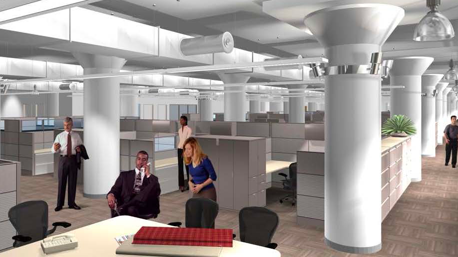 On one and a half floors in the Starrett Lehigh building on West 26th Street, this office build-out that has a high-tech industrial look with exposed ceilings was completed via a fast-track schedule comprising 20 phases. The project includes private offices at the center of the space surrounded by open-plan perimeter offices, a board room along with ten conference rooms, a data center, fashion labs and library and cafeteria. A new mechanical/electrical & plumbing system was installed as well as an access stairway between the fifth and sixth floors. In addi-tion, the entire office exterior perimeter was encased with aluminum sliding windows to make existing landmark windows accessible.